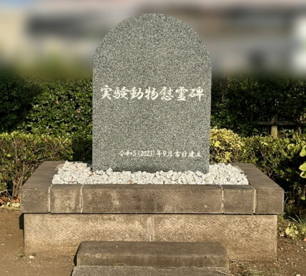 The original monument was erected in 1978 at the Yōga Office, when Building 8 was completed during the establishment of the Center for Biological Safety and Research. Unfortunately, it was damaged during its relocation to the Tonomachi Office. To honor and perpetuate our respect and gratitude for laboratory animals, a new monument was erected in September 2023.