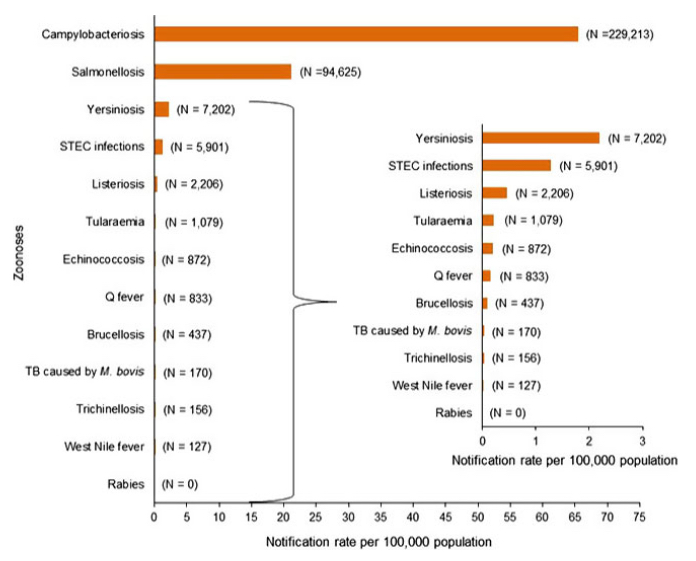 欧州食品安全機関(EFSA)および欧州疾病予防管理センター(ECDC)による本報告書は、欧州の32カ国(欧州連合(EU)加盟28国および非加盟4カ国)が2015年に実施した人獣共通感染症モニタリングの結果を記載したものである。