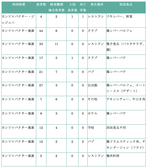表2:イングランドおよびウェールズでの食品由来カンピロバクター症アウトブレイク(2015年)