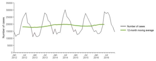 図2:カンピロバクター症確定患者数の月別分布(EU/EEA、2012〜2016年)