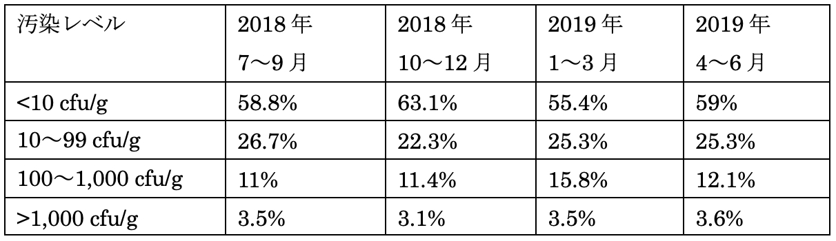 この最新データによると、主要な食品小売チェーン9社の平均で、検査した丸鶏の3.6%が最高レベル(>1,000 cfu/g)のカンピロバクター汚染を示した。