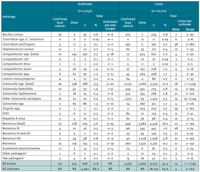 セレウス菌、ウェルシュ菌および黄色ブドウ球菌は患者で確認されることは稀で、ほとんどが食品から検出される。原因食品が特定されたアウトブレイクで多く検出された病原体はセレウス菌、サルモネラ属菌、ノロウイルスの順であった(表1)。