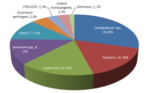 これに対して、カンピロバクター症アウトブレイク件数は増加し(2010年18件、2009年13件)、この増加は家禽のレバーパテ/パルフェの喫食と関連していた(2009年が9/13、2010年が14/18)。患者数も同様に2010年は2009年から増加した。2010年のアウトブレイクから得られたエビデンスによると、特別に食品提供業者(caterers)に向けた食品安全上の助言が出されているにも関わらず、2009年と同様、仕出し業者がレバーを用いたパルフェやパテを調理する際に、中心部に赤味を残すためにわざと十分に加熱しなかったことが明らかになった。