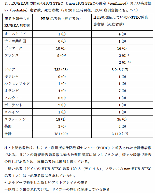 7月26日時点でEU/EEA域内のSTEC確定患者の累積数は935人であり、HUS STEC患者が263人、non-HUS STEC患者が672人である。また、現時点ではSTEC O104感染と確定されていない高度疑い患者は、HUS STECが518人、non-HUS STECが2,447人である。EU内では、確定または高度疑いSTEC患者46人が死亡しており、このうち29人がHUS STEC、17人がnon-HUS STECであった。表は、高度疑い患者および確定患者の国別の累積患者数である。